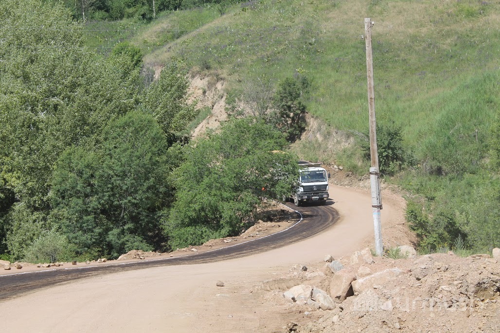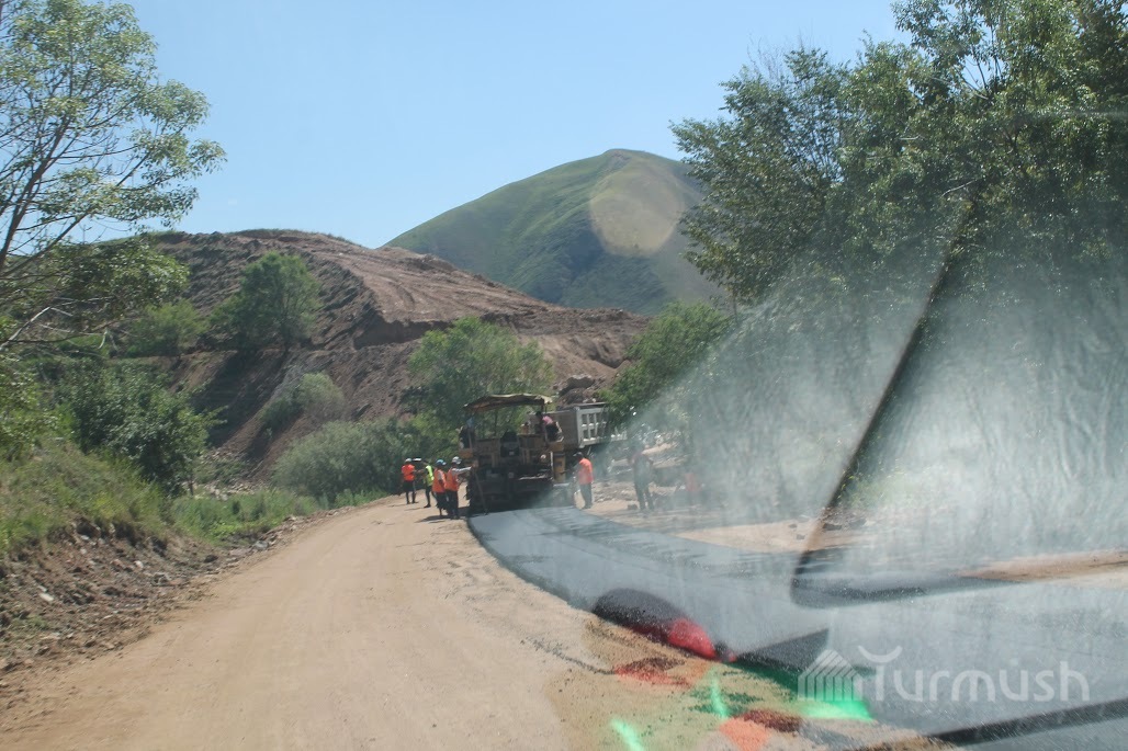 Токтогул районундагы Толук—Торкен унаа жолуна асфальт төшөлүүдө (фото)