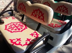 Токтогулдук жубайлар унаага кыргыз орнаменти түшүрүлгөн жабууларды жасайт